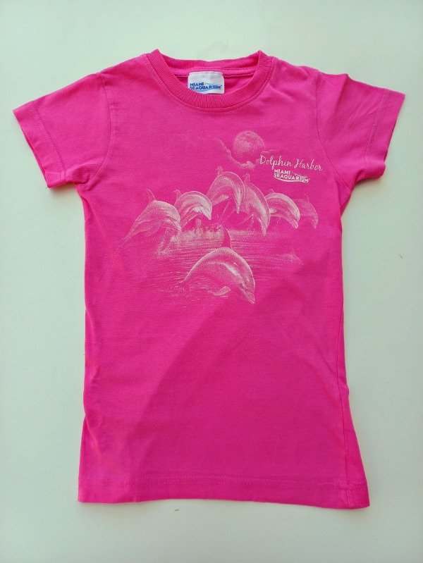 Remera manga corta de algodón color rosa con estampa al frente. Medidas: ancho de hombro 26,5 cm, largo 50 cm. USADO, buen estado