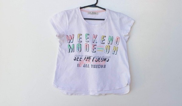Remera manga corta de algodón en color blanco con estampa con lentejuelas. Medidas: ancho de hombro 30 cm, largo 46 cm. USADO, buen estado