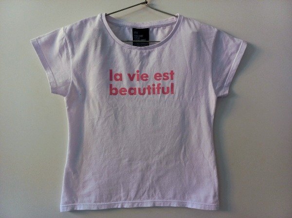 Remera manga corta de algodón en color blanco con estampa al frente. Medidas: ancho de hombro 38,5 cm, largo 47 cm. COMO NUEVO
