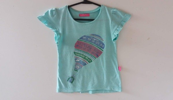 Remera manga corta de algodón en color celeste con estampa. Tiene terminación de volados en las mangas. Medidas: ancho de hombro 26 cm, largo 42 cm. USADO, buen estado
