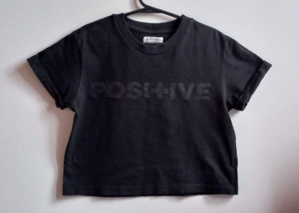 Remera tipo pupera manga corta de algodón en color negro con estampa con brillo. Medidas: ancho de hombro 33 cm, largo 38 cm. USADO, buen estado