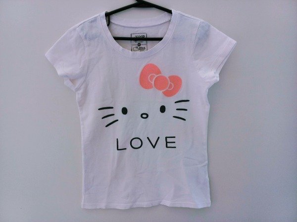 Remera manga corta de algodón color blanco con estampa kitty con brillo. Medidas: ancho de hombro 28 cm, largo 49 cm. USADO, buen estado