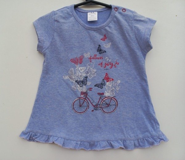 Remera manga corta de algodón color azul melange con estampa con brillos y terminación en volado. Medidas: ancho de hombro 21 cm, largo 36 cm. COMO NUEVO