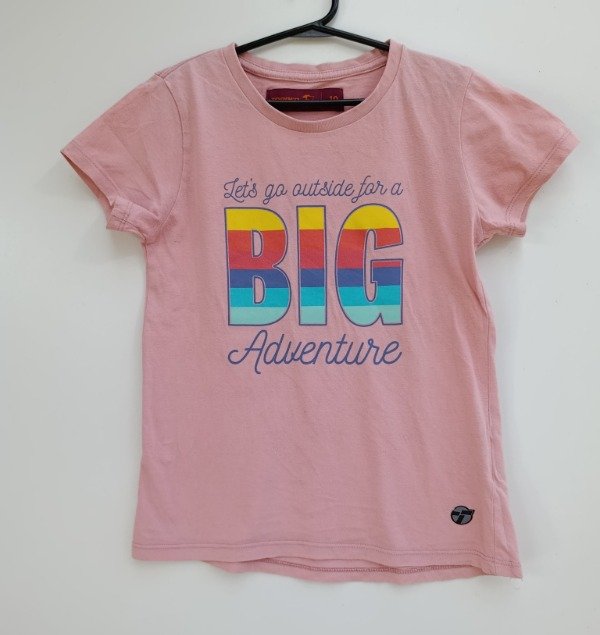 Remera manga corta de algodón en color coral con estampa al frente. Medidas: ancho de hombro 31 cm, largo 50 cm. USADO, buen estado