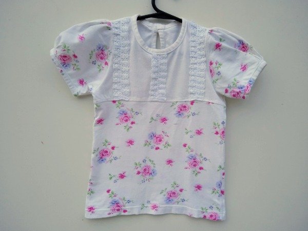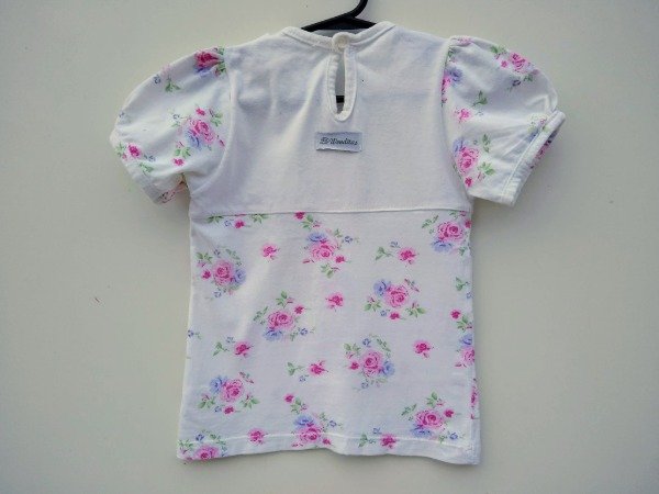 Remera manga corta de algodón estampado con detalle de puntillas en el pecho. Medidas: ancho de hombro 21 cm, largo 39,5 cm. USADO