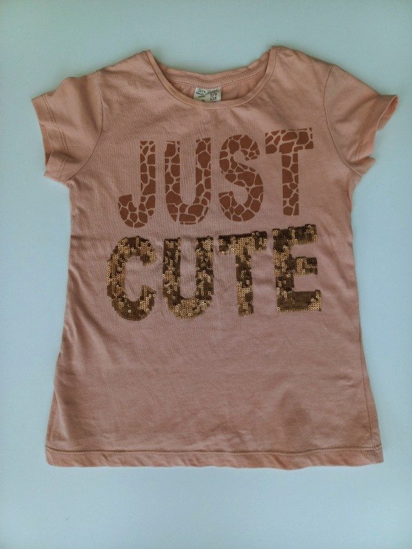 Remera manga corta de algodón color coral con estampa bordada en lentejuelas. Talle 5-6 años. Medidas: ancho de hombro 27 cm, largo 45 cm. COMO NUEVO