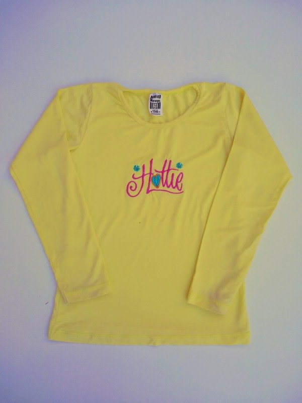 Remera manga larga de algodón color amarillo con estampa bordada al frente. Medidas: ancho de hombro 27 cm, largo de manga 45 cm, largo total 49 cm. COMO NUEVO