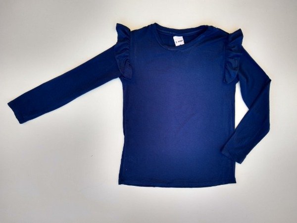 Remera manga larga de algodón color azul con volados en los hombros. Medidas: ancho de hombro 31 cm, largo de manga 46 cm, largo total 51 cm. COMO NUEVO