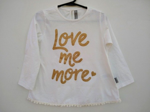 Remera manga larga en color blanco con inscripción al frente en dorado. Medidas: ancho de hombro 23 cm, largo de manga 34 cm, largo total 42 cm. COMO NUEVO