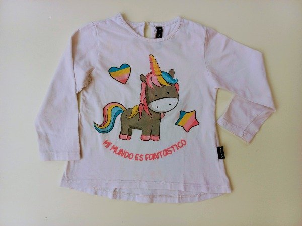 Remera manga larga de algodón color blanco con estampa al frente. Medidas: ancho de hombro 24 cm, largo de manga 30,5 cm, largo total 38 cm. USADO