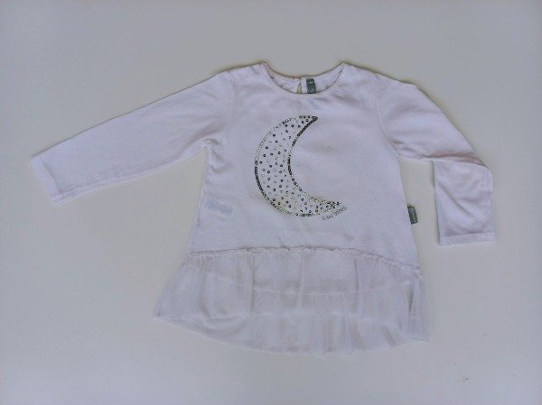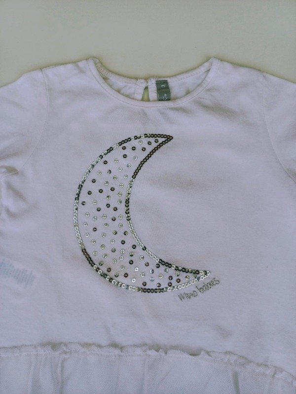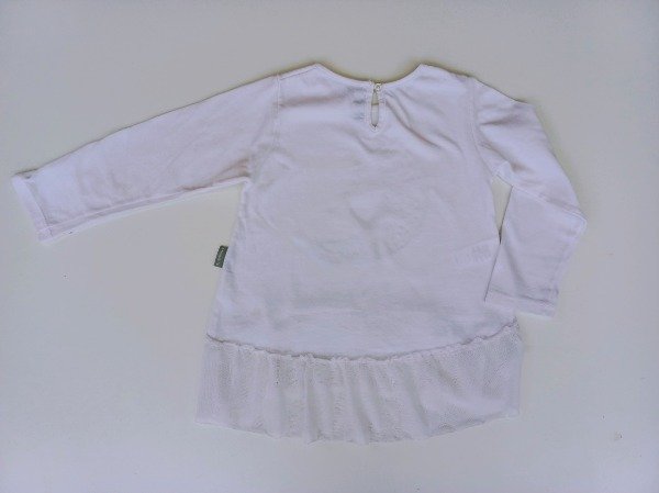 Remera manga larga de algodón color blanco con bordado en lentejuelas y terminación en volado de tul. Medidas: ancho de hombro 23,5 cm, largo de manga 34 cm, largo total 42 cm. COMO NUEVO
