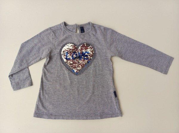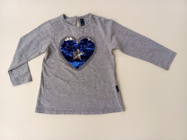 Remera manga larga de algodón color gris melange. Tiene al frente corazón de lentejuelas bifaz en color azul/plata. Medidas: ancho de hombro 22 cm, largo de manga 32 cm, largo total 40,5 cm. USADO, muy buen estado