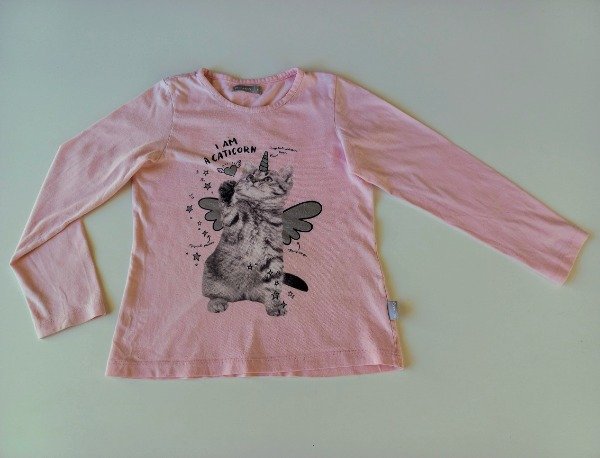 Remera manga larga de algodón color rosada con estampa con brillo. Medidas: ancho de hombro 27 cm, largo de manga 43,5 cm, largo total 46 cm. USADO, buen estado