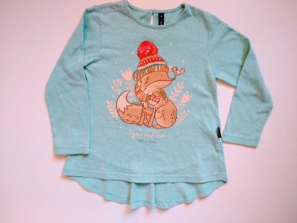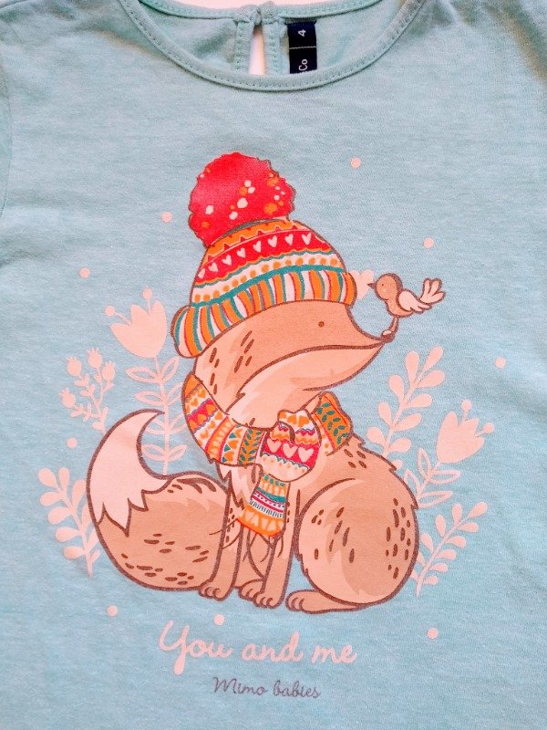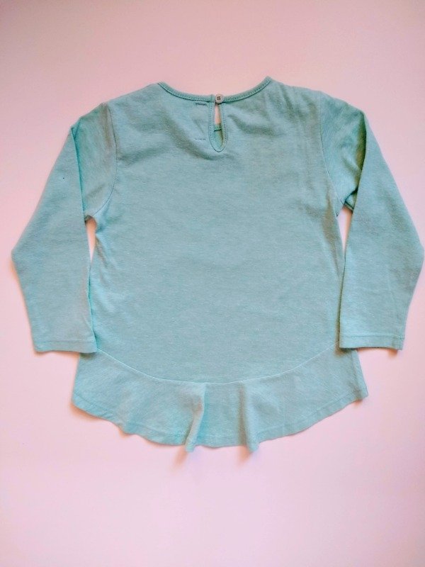 Remera manga larga de algodón con estampa al frente. Tiene abertura con botón en la espalda y volado en la parte posterior. Medidas: ancho de hombro 26 cm, largo de manga 34 cm, largo total 41 cm. USADO, excelente estado