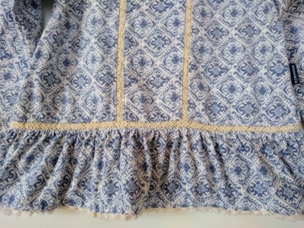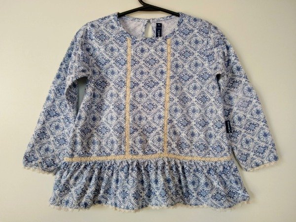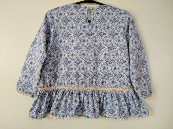 Remera manga larga de algodón estampado con detalle de puntillas de algodón. Medidas: ancho de hombro 24 cm, largo de manga 31 cm, largo total 39 cm. USADO, buen estado salvo una manchita casi imperceptible en una de las mangas.