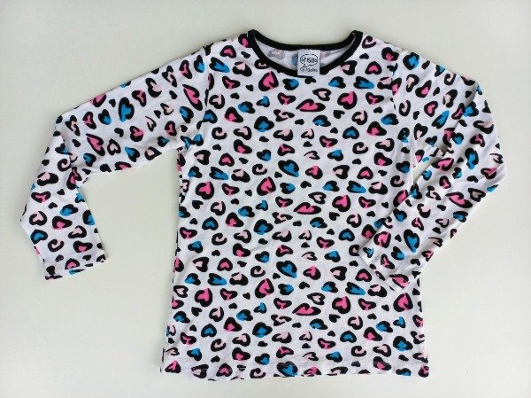 Remera manga larga de algodón estampado corazones. Talle 9-10 años. Medidas: ancho de hombro 27 cm, largo de manga 45 cm, largo total 51 cm. COMO NUEVO
