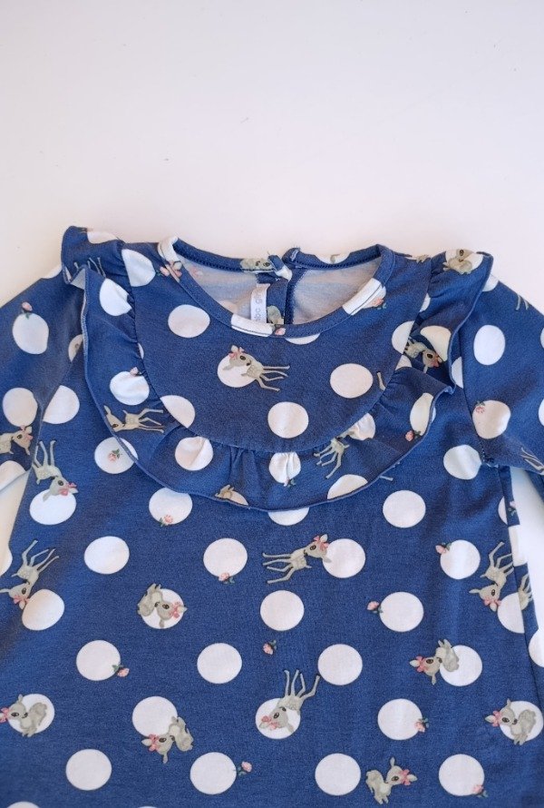 Remera manga larga de algodón en color azul estampado. Tiene volados alrededor del cuello y botones en la parte posterior. Talle 4-6 años. Medidas: ancho de hombro 28 cm, largo de manga 41,5 cm, largo total 45,5 cm. COMO NUEVO