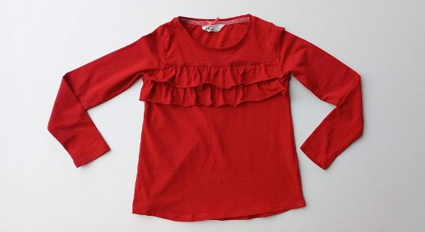 Remera manga larga de algodón en color rojo con detalle de volados en el frente. Talle 8-10 años. Medidas: ancho de hombro 28 cm, largo de manga 55 cm, largo total 51 cm. COMO NUEVO