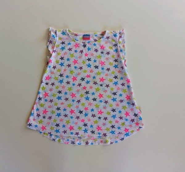 Remera sin mangas de algodón estampado estrellas. Tiene terminación de volados en las mangas. Medidas: ancho de sisa a sisa 40 cm, largo 50 cm. USADO, buen estado