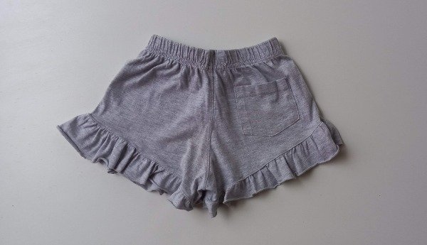 Short de algodón en color gris melange con terminación de volado. Medidas: cintura 24 cm, largo 23 cm. COMO NUEVO