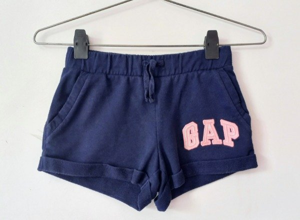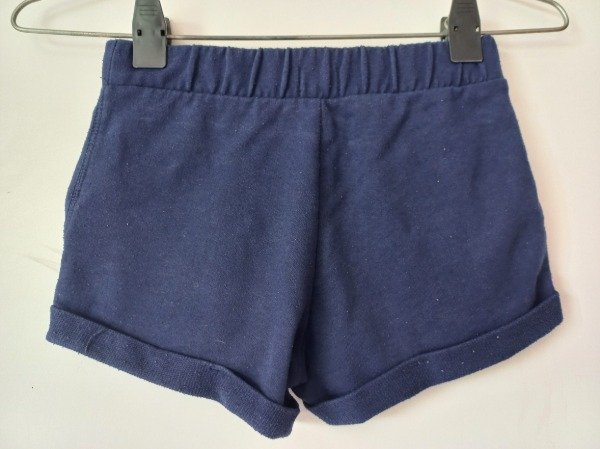 Short de algodón rústico color azul con la marca bordada en lentejuelas rosa. Talle 6-7 años. Medidas: cintura 28 cm, largo 21,5 cm. USADO, buen estado
