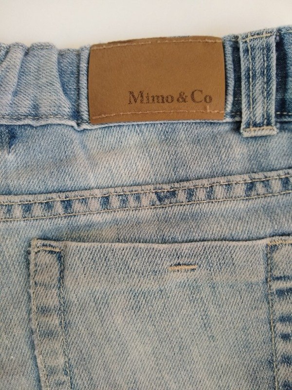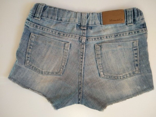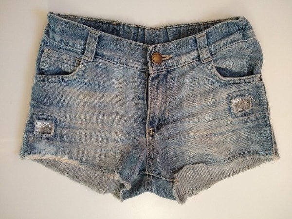 Short de jean efecto gastado con apliques en lentejuelas plateadas. Elástico en la cintura para regular calce. Medidas: cintura 28 cm, largo 22 cm. USADO