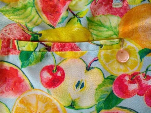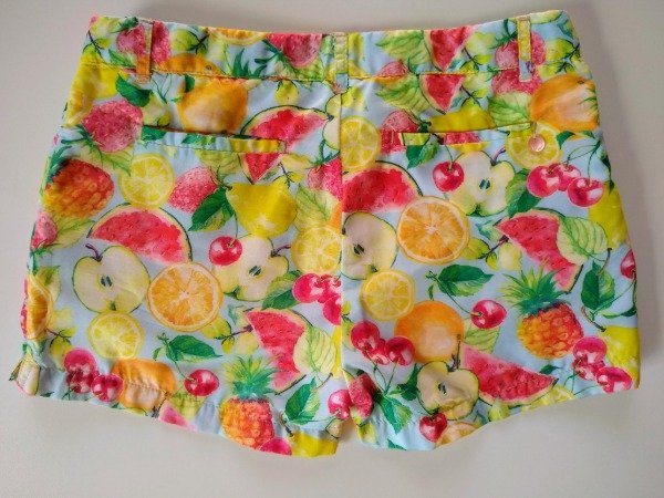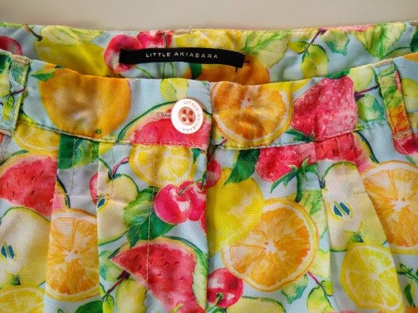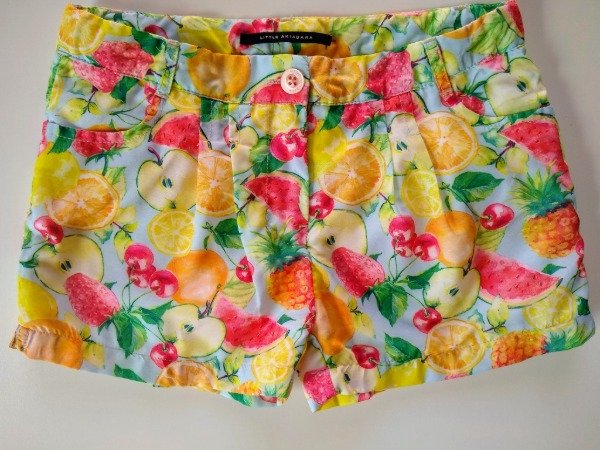 Short de seda estampado frutal, integramente forrado. Tiene elástico en la cintura para regular la misma. Medidas: cintura 30 cm, largo 22 cm. COMO NUEVO