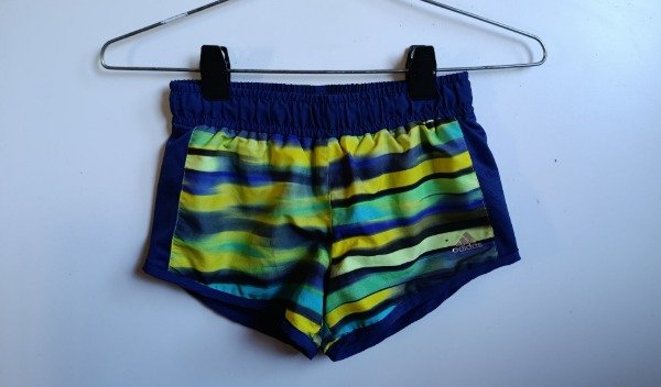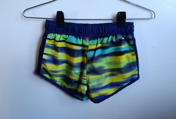Short deportivo climalite en combinación de colores azul, verde y amarillo. Tiene cordón y elástico en la cintura. Medidas: cintura 27 cm, largo 22 cm. USADO, buen estado
