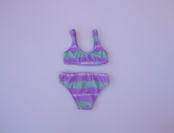 Bikini forrada integramente en su interior en colores lila y verde batik. Medidas: corpiño : base 23 cm, alto 18,5 cm, bombacha: cintura 24 cm, alto 18,5 cm. COMO NUEVO