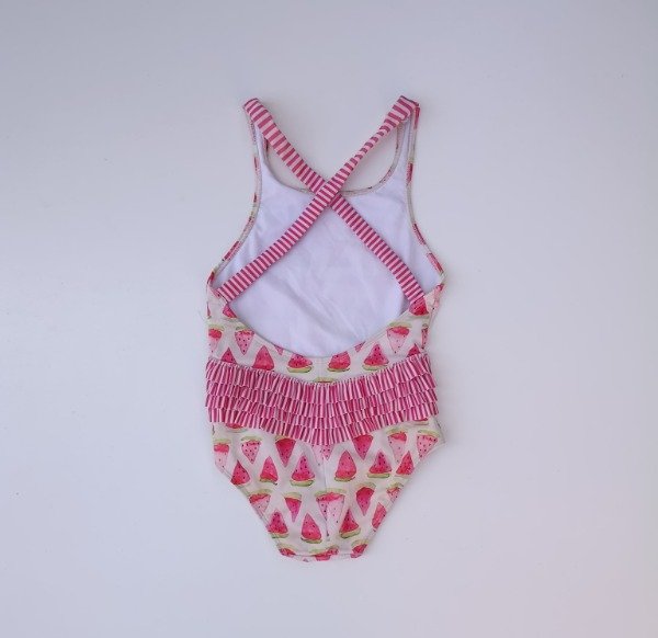 Malla enteriza de lycra estampado sandías. Integramente forrada. Medidas: ancho de sisa a sisa 31 cm, largo total 56 cm. USADO