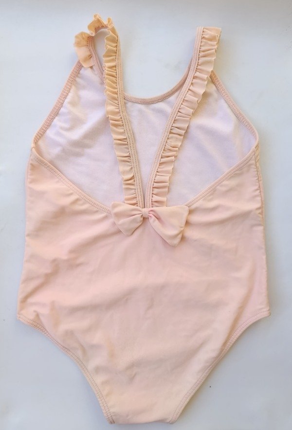Malla enteriza de lycra en color rosado con forro interior. Tiene detalle de volados en las tiras y moño por la espalda. Medidas: ancho de sisa a sisa 31 cm, largo 52 cm. USADO, buen estado