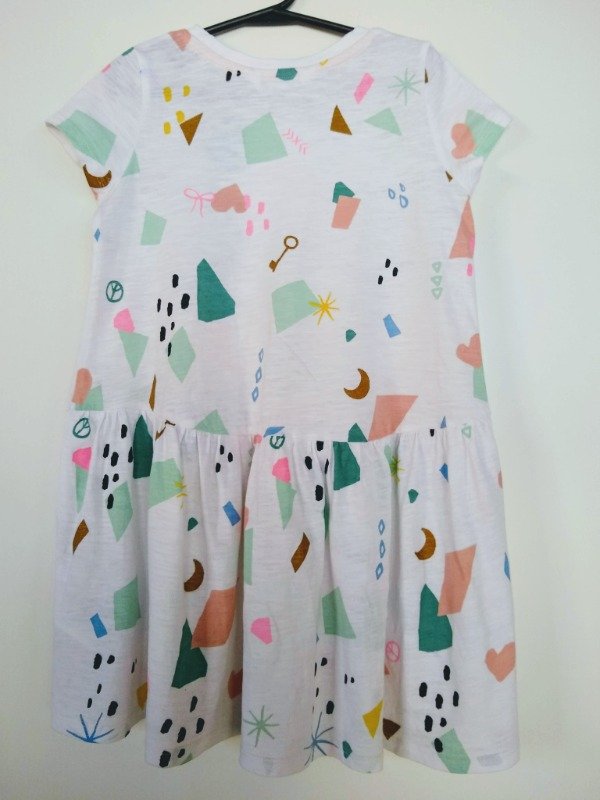 Vestido manga corta de algodón color blanco con figuras en tono pastel. Terminación con volado irregular, más largo en la espalda. Talle 2-4 años. Medidas: ancho de hombro 27 cm, largo total 59 cm. COMO NUEVO