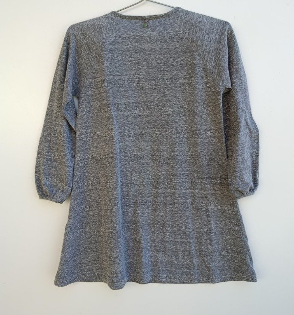 Vestido manga larga de algodón con color gris melange con detalle estampado en el pecho. Tiene voladitos a lo largo de las mangas. Medidas: ancho de sisa 41 cm, largo de manga 41 cm, largo total 73 cm. COMO NUEVO