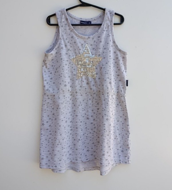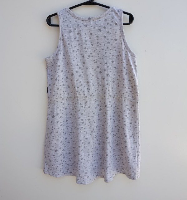 Vestido sin mangas de algodón en color gris estampado con aplique de estrella en lentejuelas al frente. Medidas: ancho de sisa a sisa 36 cm, largo 64 cm. USADO, buen estado