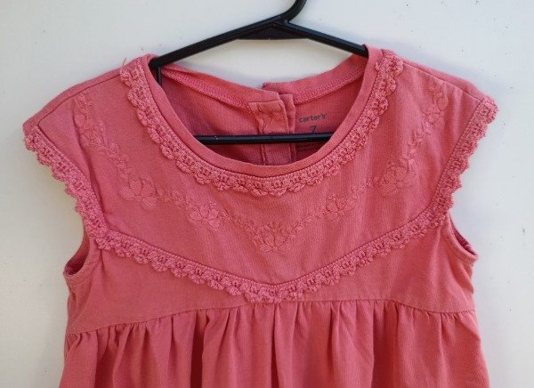 Vestido sin mangas de algodón en color coral. Tiene bordado y puntillas en la pechera. Medidas: ancho de sisa a sisa 31 cm, largo 67 cm. USADO, buen estado