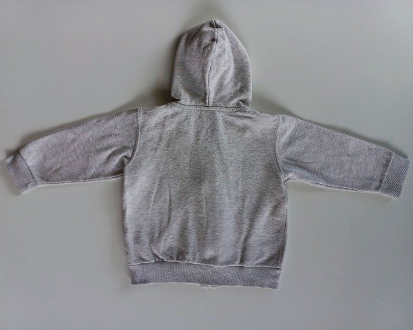 Campera de algodón con frisa en color gris melange. Tiene capucha y bolsillos canguro. Medidas: ancho de hombro 31 cm, largo de manga 31 cm, largo total 38 cm. USADO, buen estado