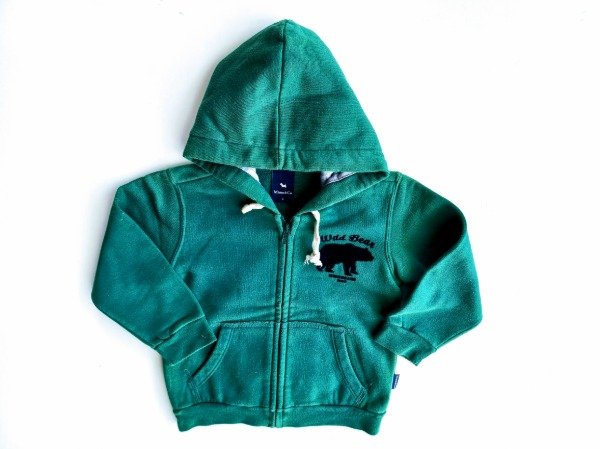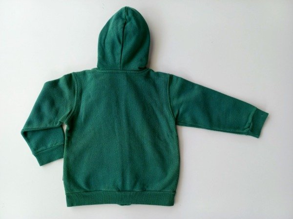Campera de algodón con friza color verde. Tiene capucha y bolsillos canguro. Medidas: ancho de hombro 32 cm, largo de manga 34 cm, largo total 40 cm. USADO, buen estado