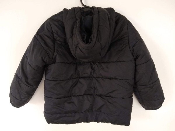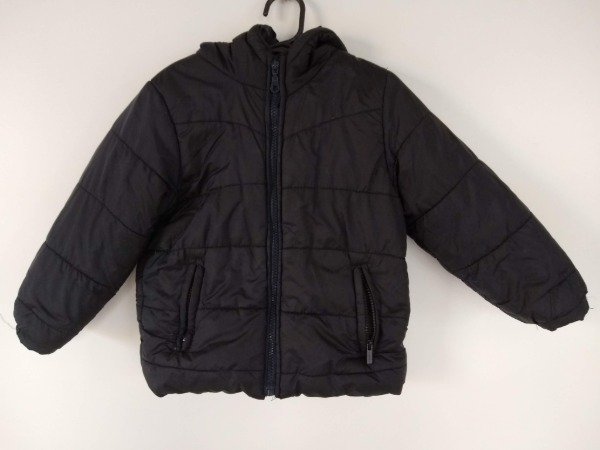 Campera de nylon matelaseada rellena con guata, con capucha, cierre central y bolsillos con cierres. Medidas: ancho hombro 31 cm, largo mangas 36 cm, largo total 43 cm. USADO, buen estado