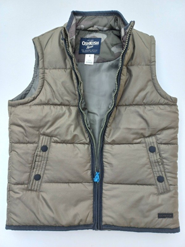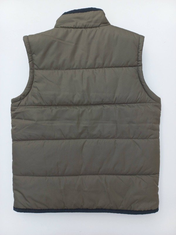 Chaleco de abrigo color verde seco con vivos en color azul. Medidas: ancho de hombro 31 cm, largo total 51 cm. NUEVO SIN ETIQUETA