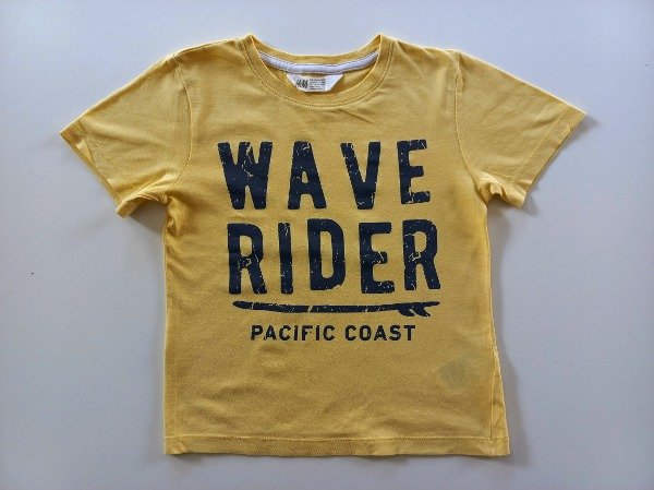 Remera manga corta de algodón en color amarillo. Talle 4-6 años. Medidas: ancho de hombro 31,5 cm, largo 45 cm. USADO, muy buen estado
