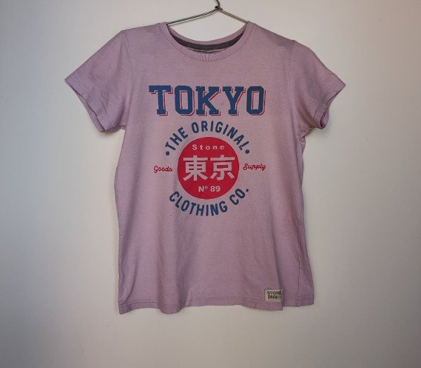 Remera manga corta de algodón en color lila con estampa al frente. Medidas: ancho de hombro 36 cm, largo 60 cm. USADO