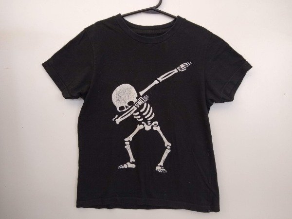 Remera m/c de algodón color negro con estampa al frente. Talle 7-8 años. Medidas: ancho de hombro 32 cm, largo 50 cm. USADO, muy buen estado