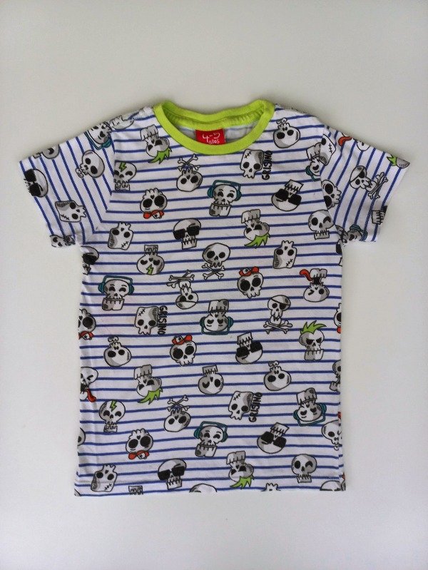 Remera manga corta de algodón rayada. Talle 4-5 años. Medidas: ancho de hombro 26 cm, largo 47 cm. USADO, buen estado