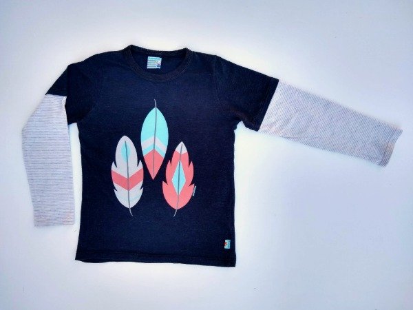 Remera m/l de algodón color negro con estampa al frente y mangas combinadas. Medidas: ancho de hombro 26 cm, largo de manga 44 cm, largo total 48 cm. USADO, buen estado