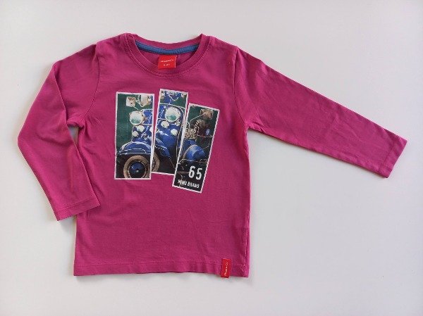 Remera manga larga de algodón color púrpura con estampa al frente. Medidas: ancho de hombro 26 cm, largo de manga 36 cm, largo total 44 cm. USADO, buen estado