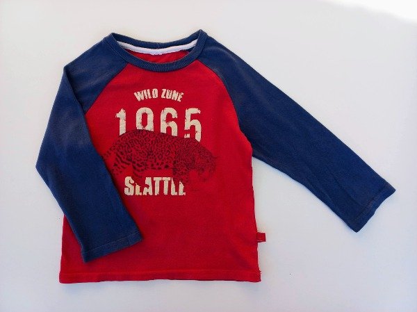 Remera manga larga de algodón en color rojo y azul. Medidas: ancho de sisa a sisa 33 cm, largo de manga 34 cm, largo total 43 cm. USADO, buen estado