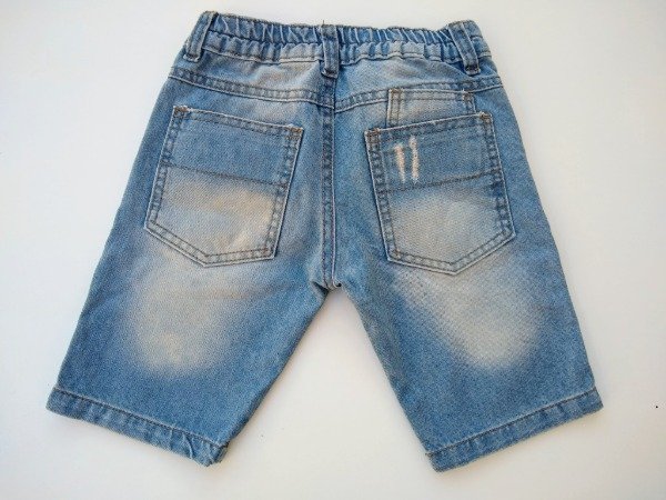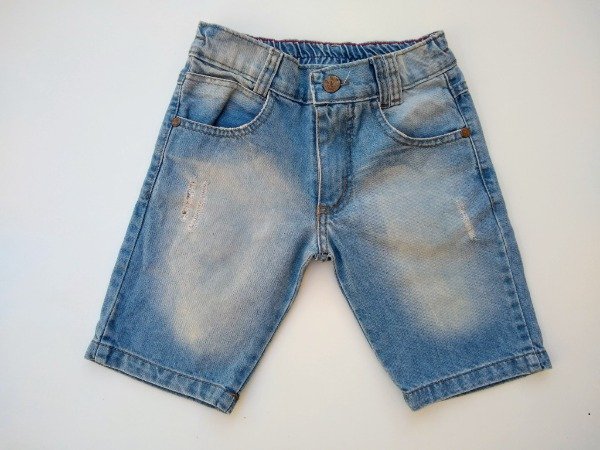 Bermuda de jean color celeste localizado con desgastes. Tiene elástico en la parte posterior de la cintura. Medidas: cintura 27 cm, largo 35 cm. USADO, muy buen estado