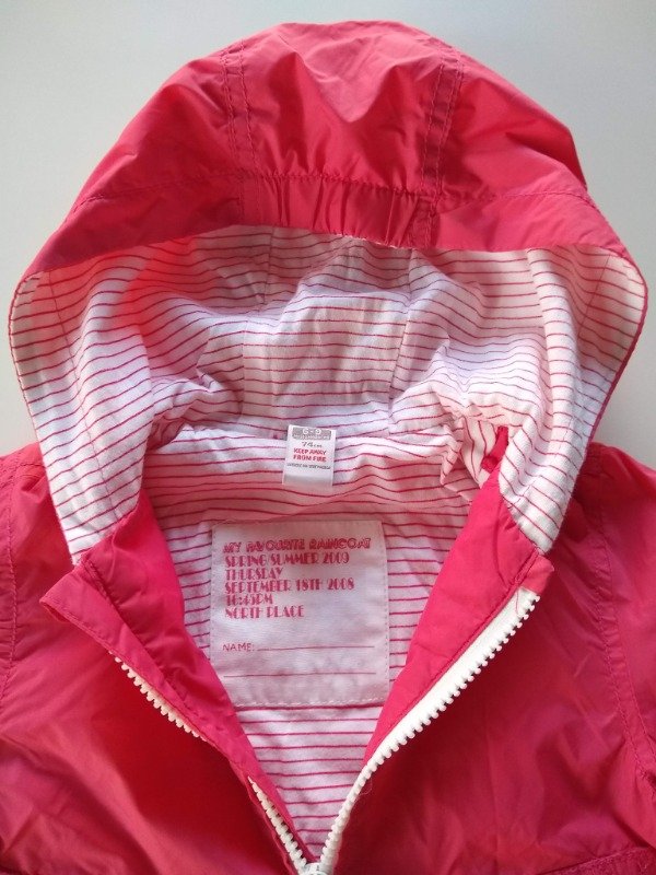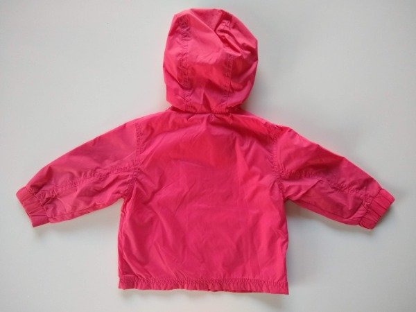 Campera impermeable con capucha y bolsillos con cierre, forrada en jersey de algodon rallado, puños elastizados. Talle 6-9 meses. Medidas: ancho de hombro 24,5 cm, largo de manga 26 cm, largo total 33 cm. COMO NUEVO