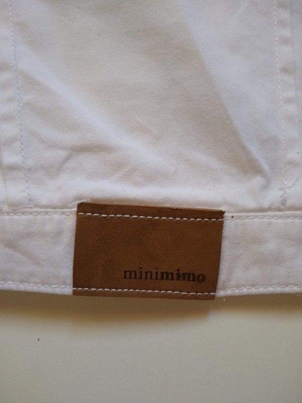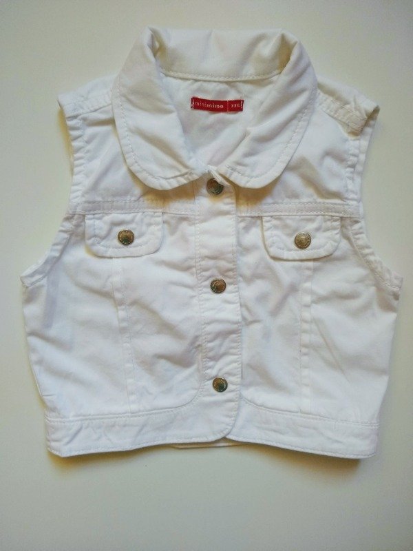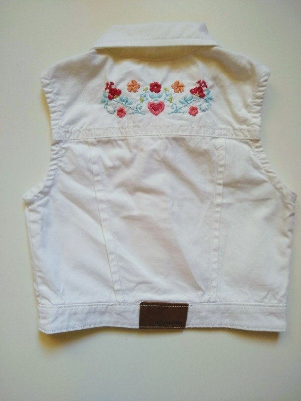 Chaleco de gabardina color blanco. Tiene bordado en la espalda. Prende con broches. Talle XXXL (18 meses). Largo total 30,5 cm. COMO NUEVO