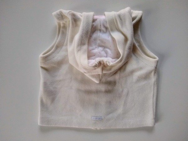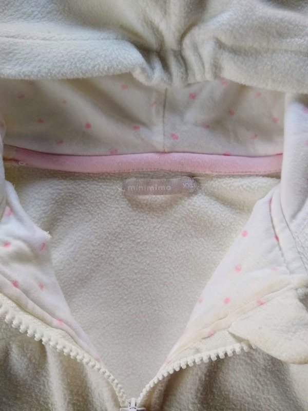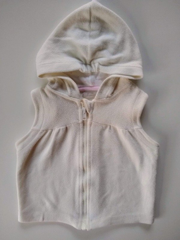 Chaleco de polar con capucha forrada en algodon con lunares rosados. Talle XXL (15-18 meses). Medidas: ancho de hombros 24 cm, largo total 35 cm. USADO